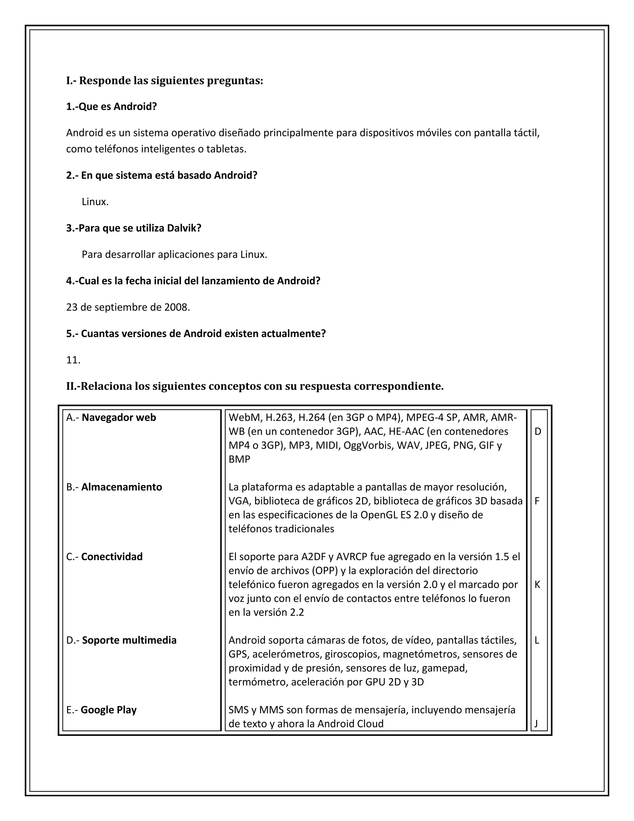 El documento proporciona información sobre Android, incluyendo que es un sistema operativo basado en Linux para dispositivos móviles, que consta de varias versiones y que incluye características como soporte multimedia, conectividad y almacenamiento. También describe herramientas de desarrollo como Eclipse, SDK y el emulador.