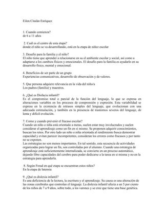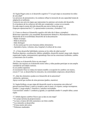 Este documento describe las características del desarrollo de los niños entre 6 y 11 años. En esta etapa, los niños se desarrollan física, mental y emocionalmente, aprendiendo habilidades sociales y académicas. Los padres y maestros juegan un papel importante en apoyar el desarrollo del niño. El documento también discute temas como el desarrollo cognitivo según Piaget, la importancia de la actividad física y una dieta saludable para los niños en edad escolar.