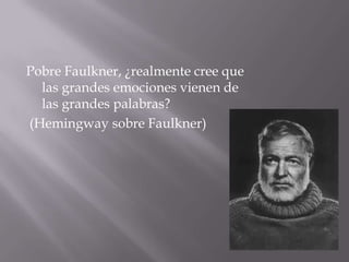 Este documento presenta tres citas y sus respectivas fuentes. La primera cita es de Ernest Hemingway criticando el estilo de William Faulkner. La segunda cita es de Pablo Neruda preguntando por qué lloran las nubes. La tercera cita es de A. Domínguez preguntando si el silencio es también un idioma. Cada cita incluye la fuente correspondiente.