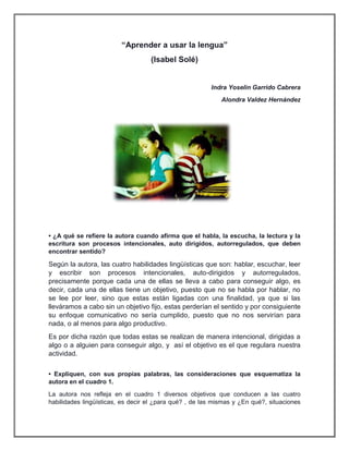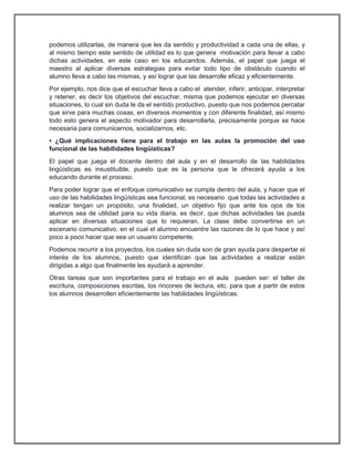 El documento discute el uso funcional de las habilidades lingüísticas como el habla, la escucha, la lectura y la escritura. La autora explica que estas habilidades son procesos intencionales que deben tener un propósito y sentido. Ella también presenta objetivos y situaciones en las que se pueden usar estas habilidades. Promover su uso funcional en el aula requiere que las actividades tengan un objetivo útil para la vida de los estudiantes y conviertan el aula en un espacio comunicativo donde puedan aplicar lo aprendido.