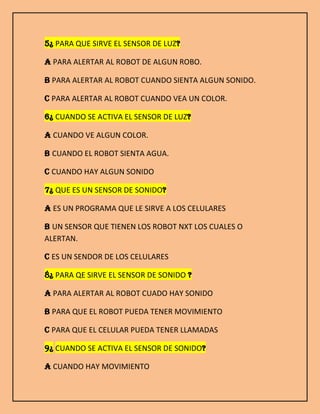 Este documento contiene preguntas sobre los diferentes sensores que tiene un robot NXT, incluyendo el sensor táctil, sensor de luz y sensor de sonido. El sensor táctil se activa cuando el robot siente que algo lo toca y le permite detectar colisiones. El sensor de luz se activa cuando detecta diferentes colores y permite que el robot sea alertado visualmente. El sensor de sonido se activa ante la presencia de sonidos y permite que el robot sea alertado auditivamente. Las funciones básicas de un robot NXT incluyen girar, av