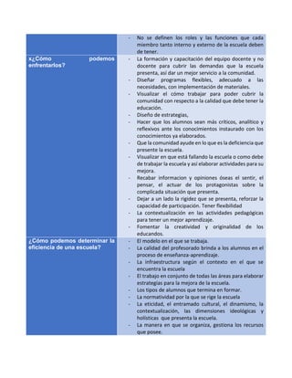 Los principales problemas que enfrenta la escuela hoy incluyen no satisfacer las necesidades de la sociedad, una deficiente capacitación de los profesores, y una falta de recursos. Para enfrentar estos problemas, se debe capacitar mejor al personal docente, diseñar programas flexibles y contextualizados, y fomentar la participación de la comunidad. La eficiencia de una escuela se puede determinar por la calidad de la enseñanza, la infraestructura, y si logra formar estudiantes críticos. Las autoridades educativas deben establecer met