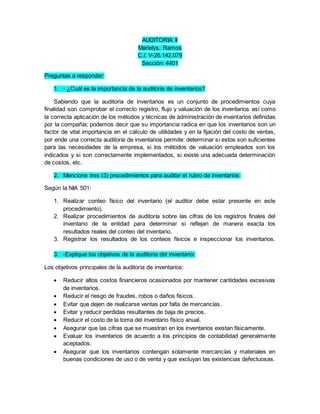 Este documento presenta un resumen de una auditoría de inventarios realizada por Marielys Ramos. Incluye preguntas sobre la importancia de auditar inventarios, procedimientos para auditarlos como conteos físicos y revisión de registros, y objetivos como reducir costos y fraudes. También cubre la información a revelar sobre políticas contables e importes de inventarios.