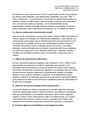 El documento presenta las respuestas de Vanessa Sarahí Martínez Sepúlveda a 9 preguntas sobre conceptos de comunicación. Explica que la comunicación es una práctica social e histórica, no solo el intercambio de mensajes. También describe que la interpretación de mensajes depende de factores psicológicos, sociales y culturales más que solo del código dominio. Finalmente, distingue entre interacciones bilaterales que implican intercambio entre emisor y receptor, e interacciones unilaterales como la comunicación masiva.