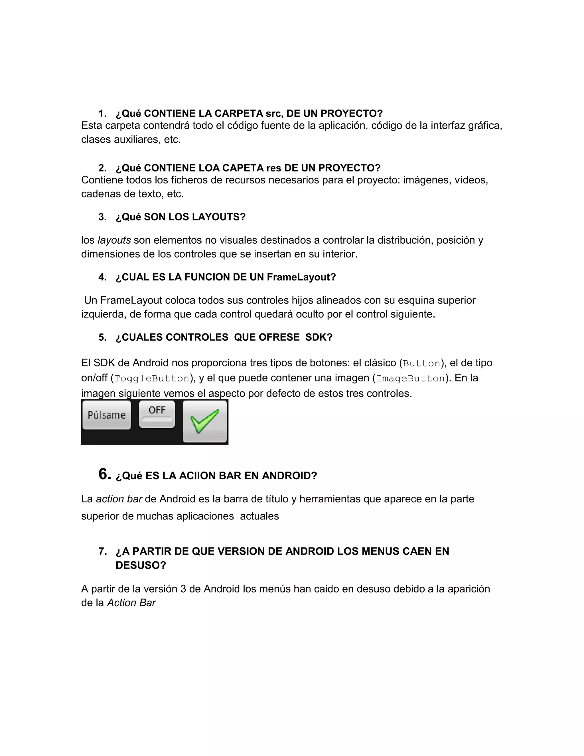 Este documento contiene preguntas y respuestas sobre varios temas relacionados con el desarrollo de aplicaciones móviles en Android, incluyendo el uso de carpetas y archivos, controles de interfaz, menús, preferencias de usuario, bases de datos SQLite y contenido proporcionado. Fue creado por el docente Eloy Contreras de Lira para el estudiante Homero Jiménez Zapata del grado 5° "B" de la Universidad Tecnológica del Estado de Zacatecas el 21 de marzo de 2013.