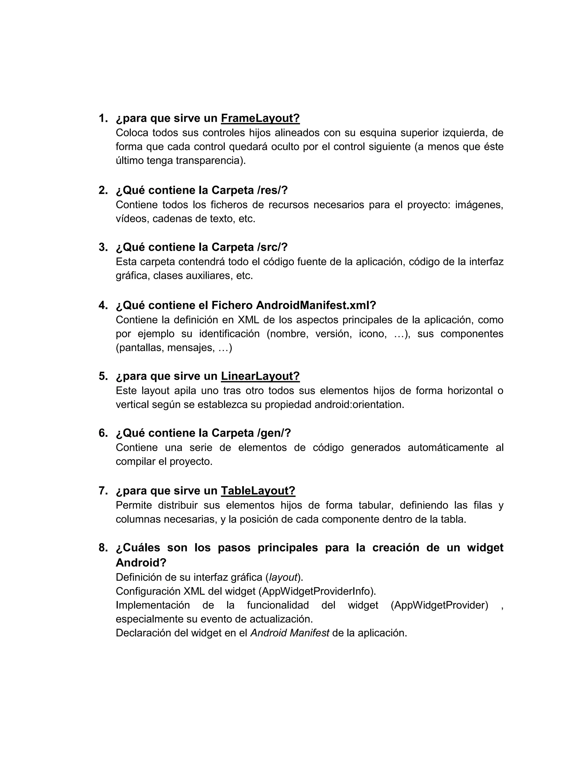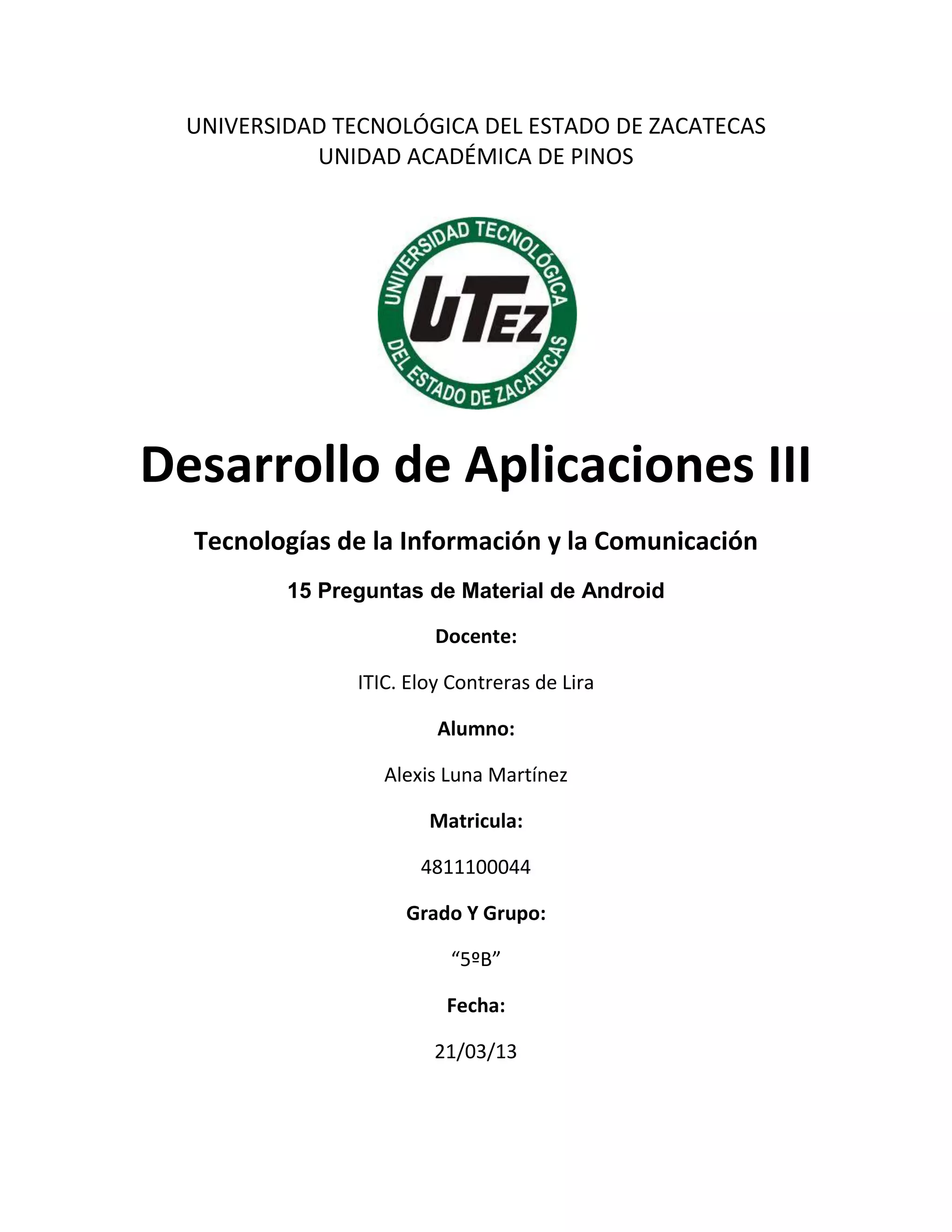 Este documento contiene 15 preguntas sobre desarrollo de aplicaciones Android realizadas por el estudiante Alexis Luna Martínez para la asignatura Impartida por el profesor Eloy Contreras de Lira. Las preguntas cubren temas como los diferentes tipos de layouts como FrameLayout, LinearLayout y TableLayout, el uso de SQLite y conten providers para almacenamiento de datos, y la creación de widgets y controles personalizados en Android.
