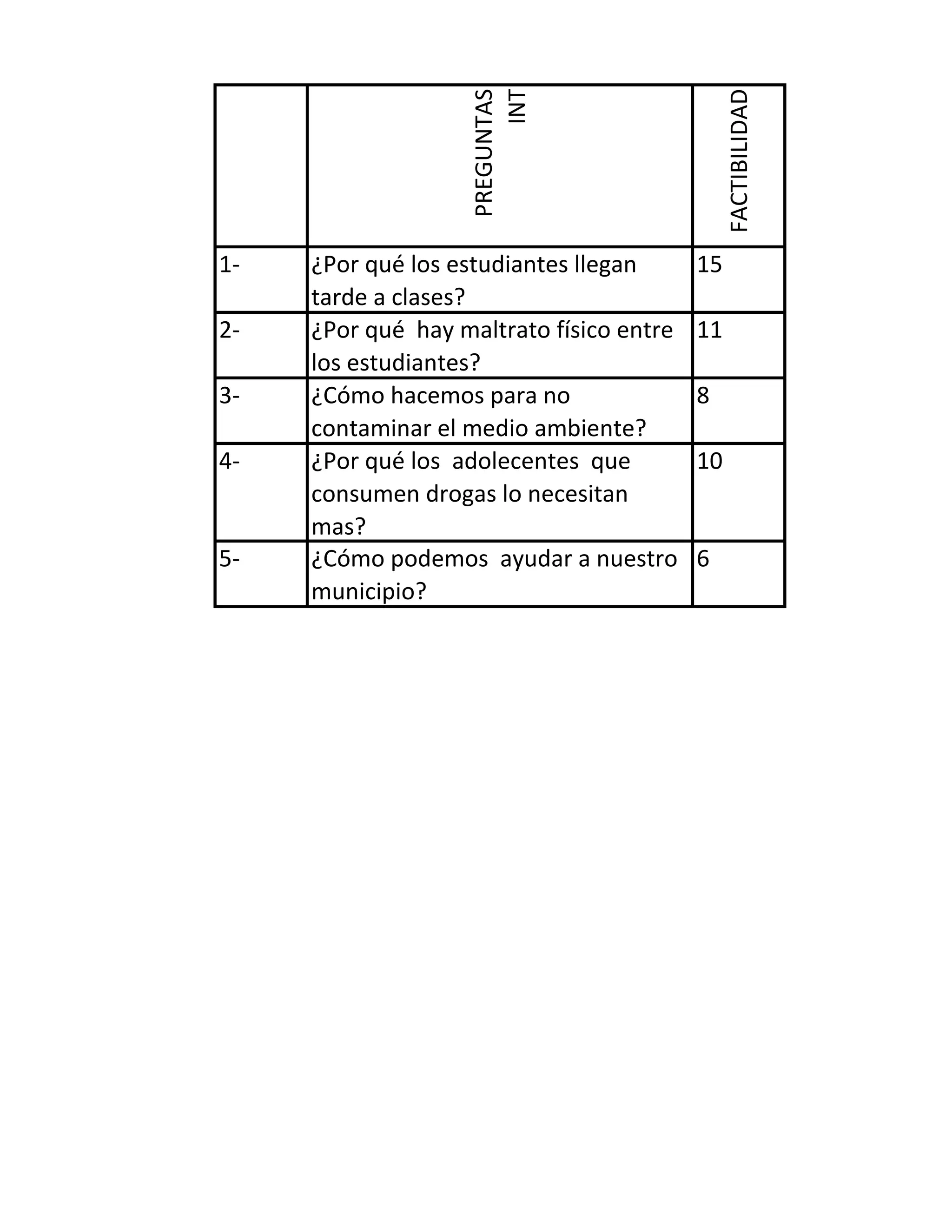 El documento presenta una lista de 5 preguntas frecuentes sobre temas relacionados con estudiantes y el medio ambiente, junto con un gráfico de torta que muestra el porcentaje de votos recibidos por cada pregunta. La pregunta sobre cómo ayudar al municipio recibió el porcentaje más bajo de votos, mientras que la pregunta sobre el maltrato entre estudiantes obtuvo el porcentaje más alto. El documento proporciona una encuesta básica sobre temas de interés para los estudiantes.
