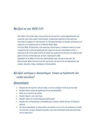 El documento resume las principales características de las redes sociales. Explica que una red social es una estructura social compuesta por individuos u organizaciones conectadas por relaciones. La primera red social creada fue Classmates.com en 1995. Actualmente existen redes populares como Facebook, Twitter y YouTube. Una Web 2.0 permite a los usuarios interactuar y colaborar como creadores de contenido. Las redes sociales tienen ventajas como la socialización y desventajas como la exposición de datos privados.