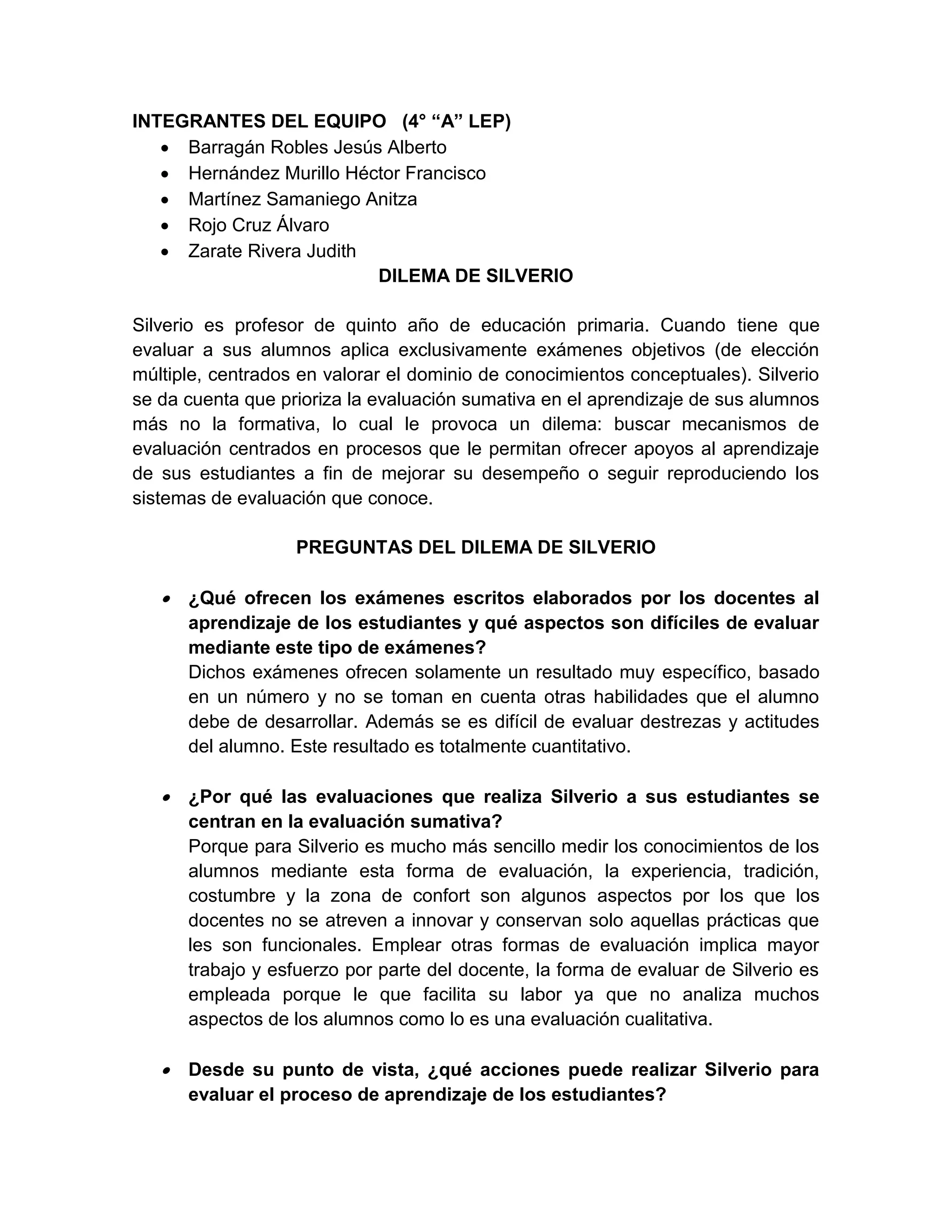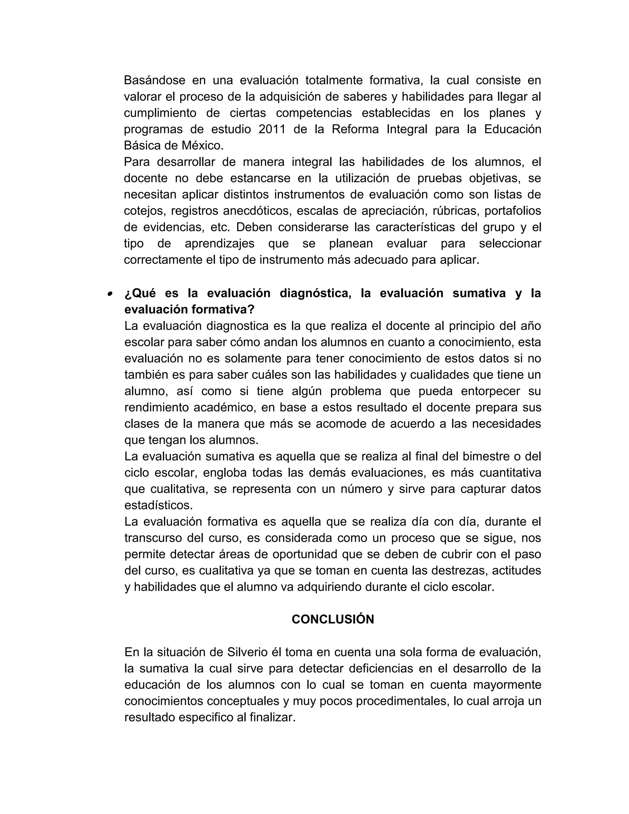 El documento presenta el dilema de Silverio, un profesor que evalúa exclusivamente con exámenes objetivos centrados en conocimientos. Esto le provoca dudas sobre si buscar nuevas formas de evaluación formativa que apoyen el aprendizaje de los estudiantes. También describe tres tipos de evaluación: diagnóstica para conocer habilidades iniciales, sumativa para medir logros al final, y formativa para dar seguimiento continuo y mejorar procesos. Silverio podría beneficiarse de aplicar diferentes métodos evaluativos que consideren diversos aspect