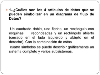 Este documento presenta las respuestas a un cuestionario sobre fundamentos de desarrollo de sistemas. El cuestionario contiene preguntas sobre diagramas de flujo de datos, diagramas de flujo lógicos vs físicos, diccionarios de datos, casos de uso y modelado de objetos. Las respuestas explican estos conceptos clave y también incluyen ejemplos como diagramas de flujo de datos y partes de un diccionario de datos.