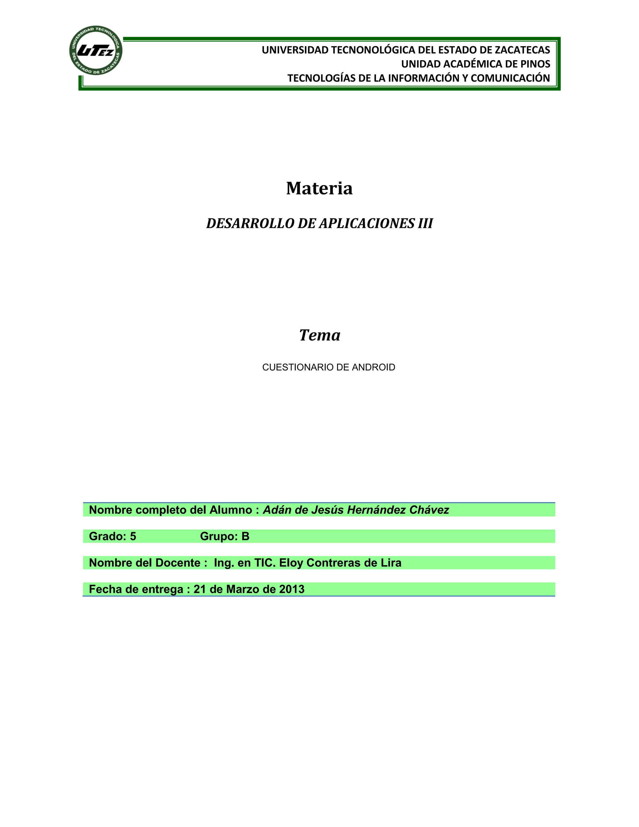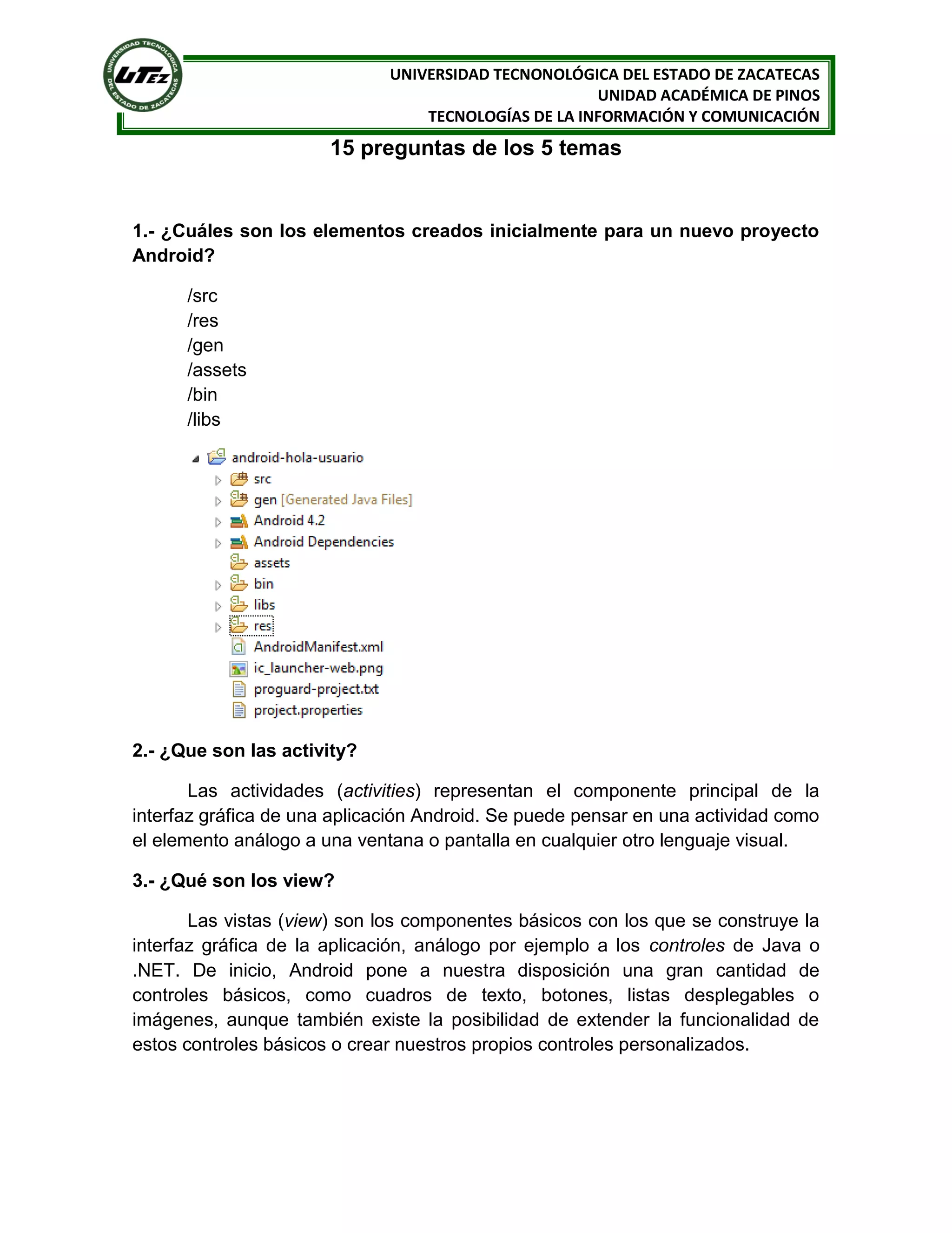 Este documento presenta un cuestionario de 15 preguntas sobre el desarrollo de aplicaciones en Android. Cubre temas como los componentes básicos de una aplicación Android, actividades, vistas, widgets, layouts y más. También incluye 5 preguntas sobre el uso de bases de datos SQLite en Android.