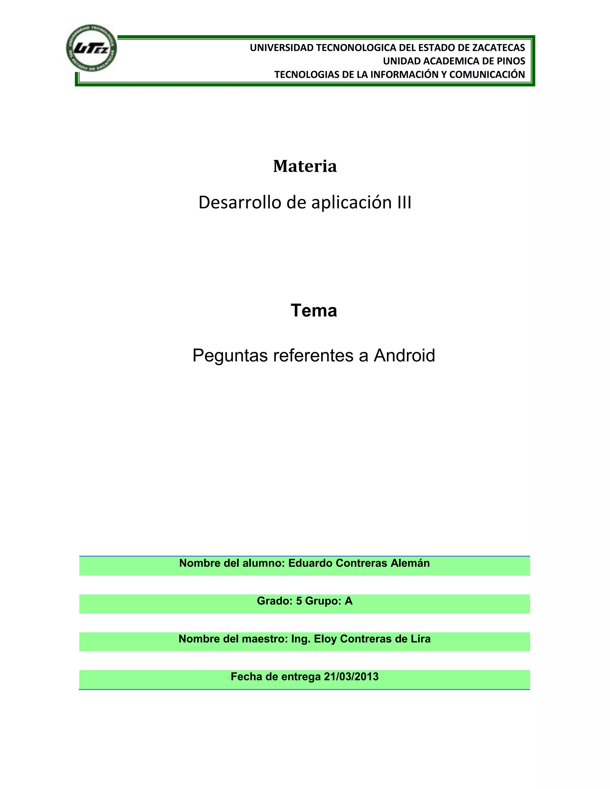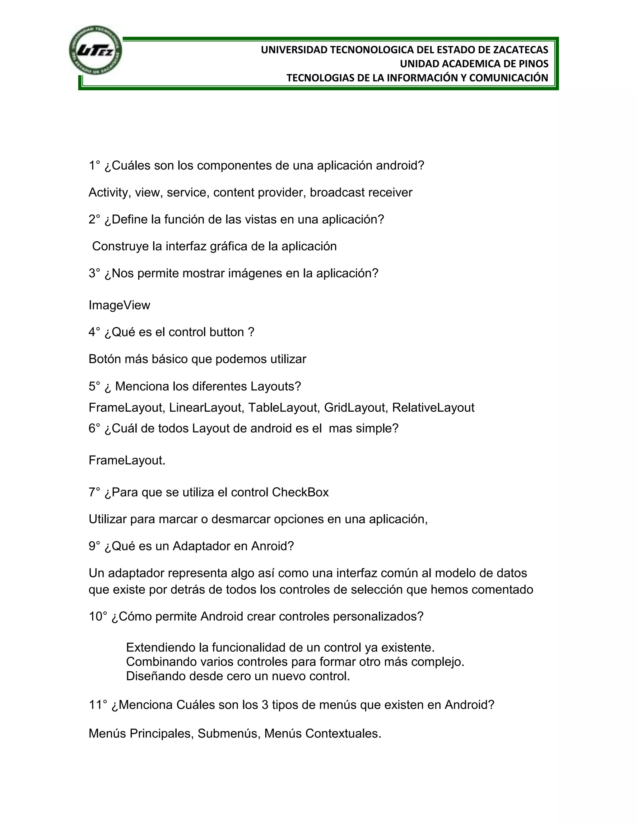 Este documento contiene 15 preguntas sobre los componentes básicos de una aplicación Android como Activity, views y servicios, así como preguntas sobre diferentes tipos de layouts, widgets, menús y almacenamiento de datos a través de SQLite y ContentProviders. También incluye 5 preguntas sobre bases de datos en Android que mencionan herramientas como SQLite, métodos como insert, update y delete, y el uso de ContentValues.