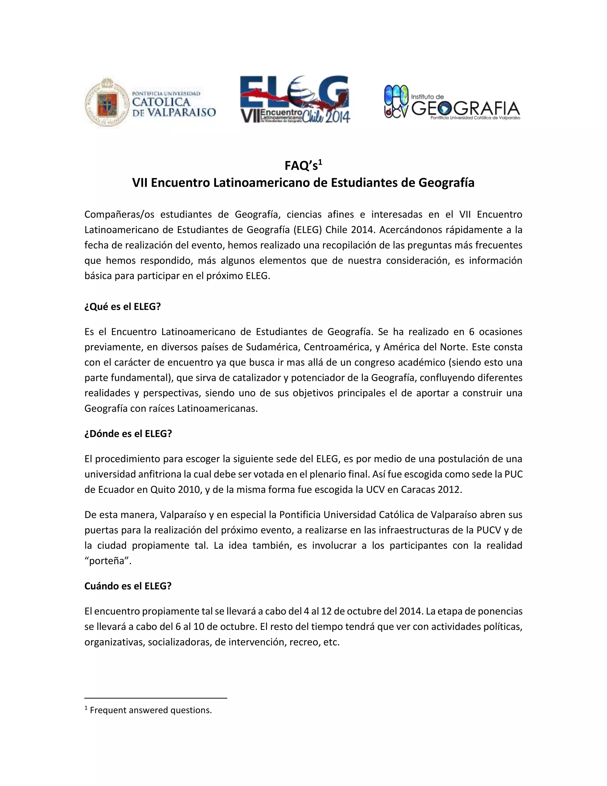 Este documento resume información práctica sobre el VII Encuentro Latinoamericano de Estudiantes de Geografía que se llevará a cabo en Valparaíso, Chile en octubre de 2014. Incluye detalles sobre las fechas del evento, el costo de inscripción de $60 dólares, cómo llegar a Valparaíso desde el aeropuerto de Santiago, y el proceso de postulación para presentar ponencias.
