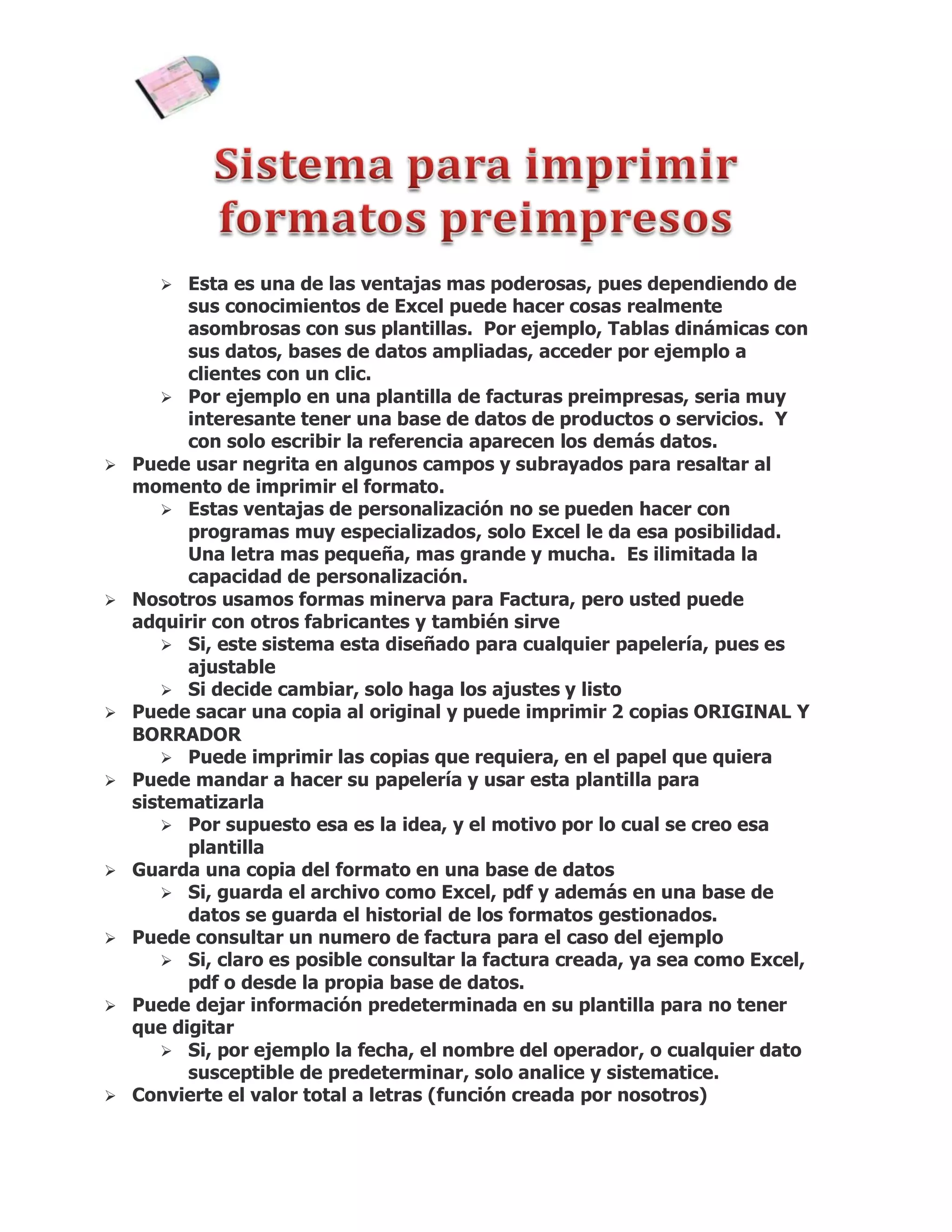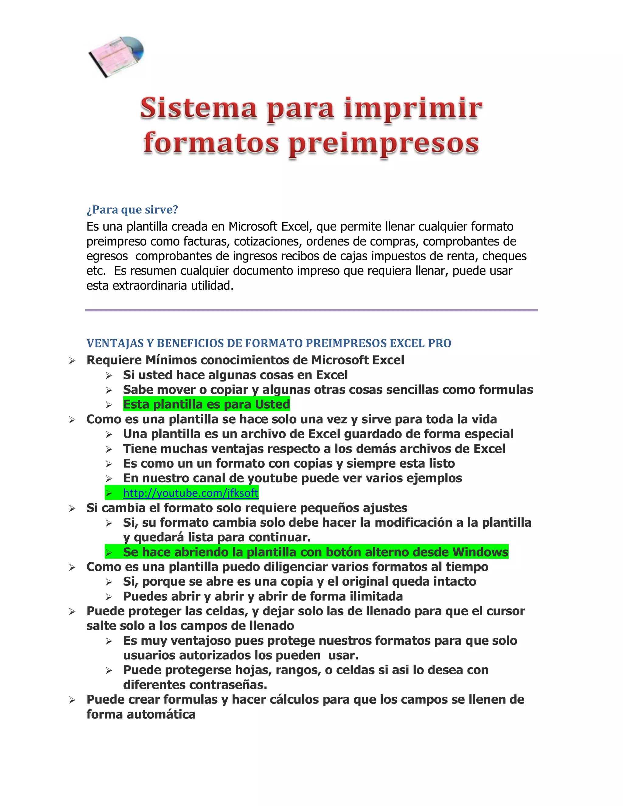 La plantilla de Excel permite crear formatos preimpresos para documentos como facturas, cotizaciones, órdenes de compra, recibos y más. Ofrece ventajas como requerir pocos conocimientos de Excel, poder proteger celdas y campos, e incluir fórmulas y cálculos automáticos. Además, permite personalizar los formatos con fuentes, imágenes y más, y generar consecutivos y códigos de barras de forma automática. La plantilla brinda flexibilidad para crear y modificar múltiples formatos ilimit
