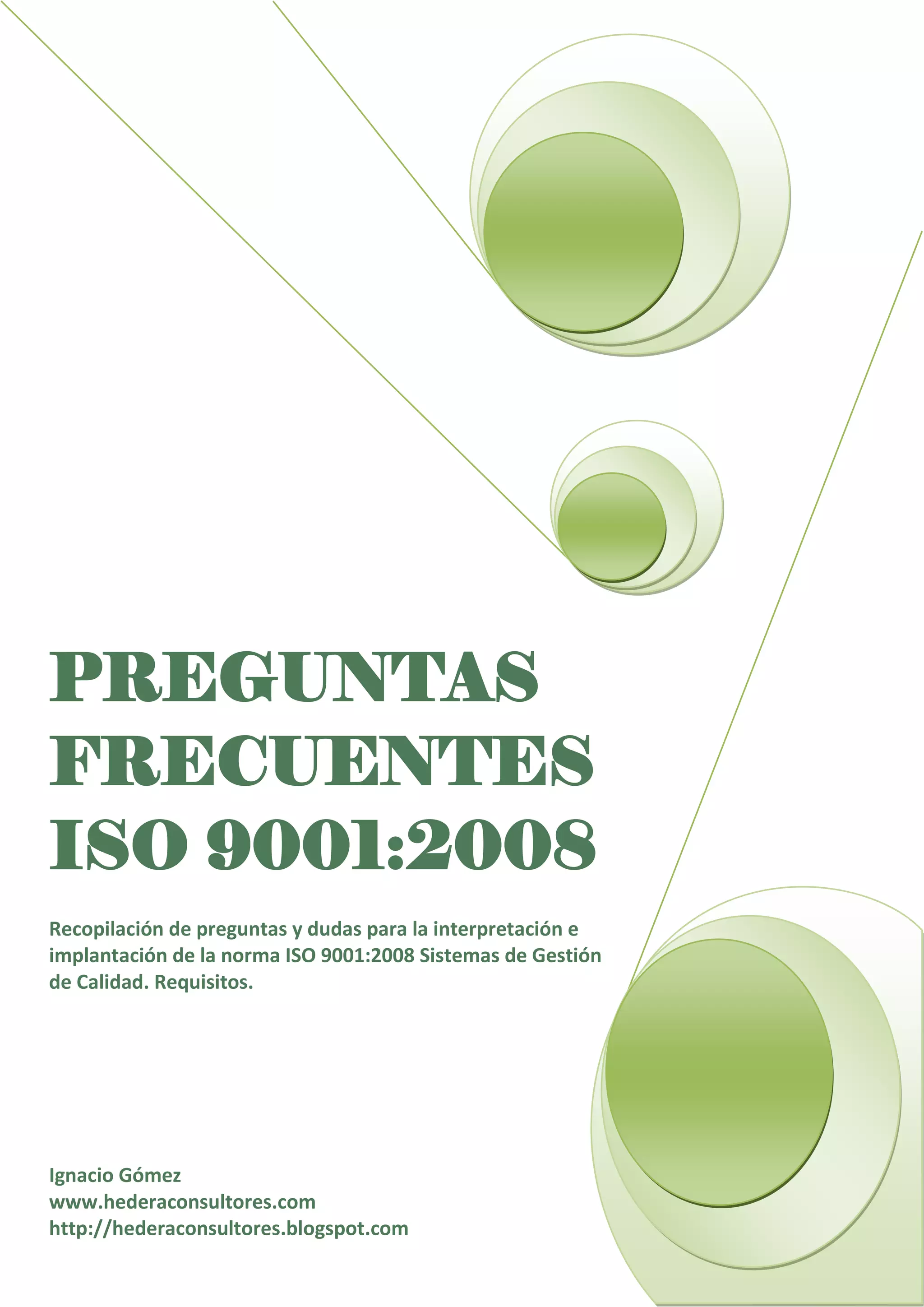 Este documento presenta una recopilación de 107 preguntas frecuentes sobre la interpretación e implementación de los requisitos de la norma ISO 9001:2008 para sistemas de gestión de calidad. Las preguntas abarcan todos los apartados de la norma e incluyen cuestiones sobre documentación del sistema, responsabilidad de la dirección, gestión de recursos, realización del producto, medición, análisis y mejora. El documento proporciona una guía práctica para ayudar a las organizaciones a comprender y cumplir con los requ
