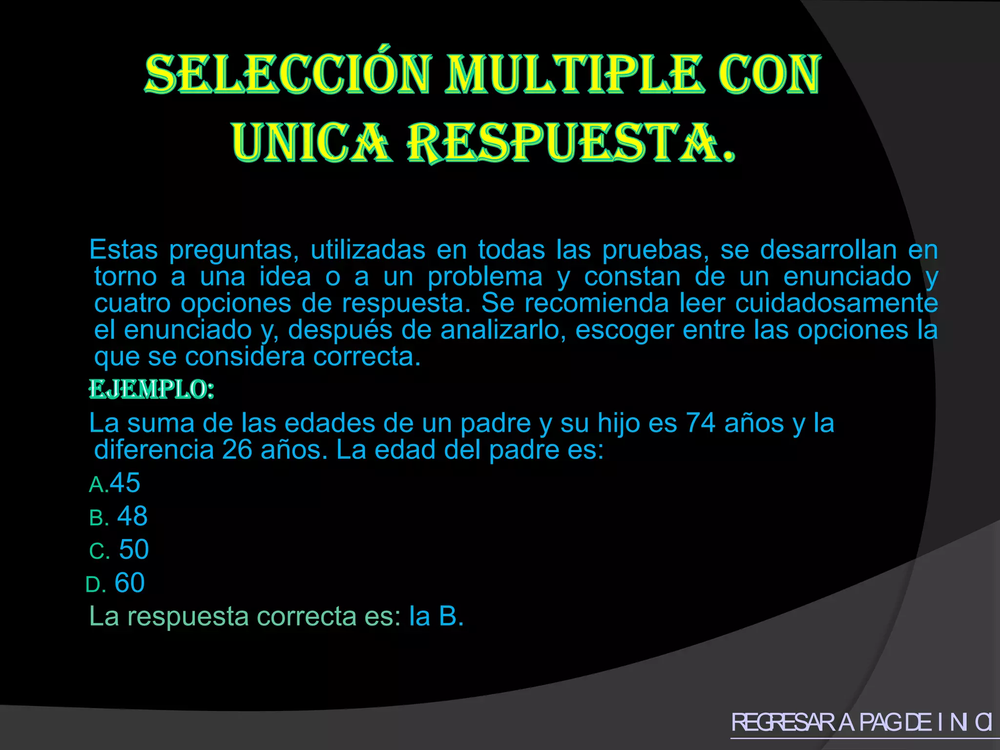 Este documento describe diferentes tipos de preguntas de selección múltiple utilizadas en pruebas de evaluación. Incluye preguntas con una única respuesta múltiple, preguntas que requieren seleccionar la combinación correcta de dos opciones, y preguntas que presentan un enunciado con cuatro posibles respuestas. También menciona que algunos tipos de preguntas como las de historia ya no se utilizan en ciertas pruebas desde el 2008.
