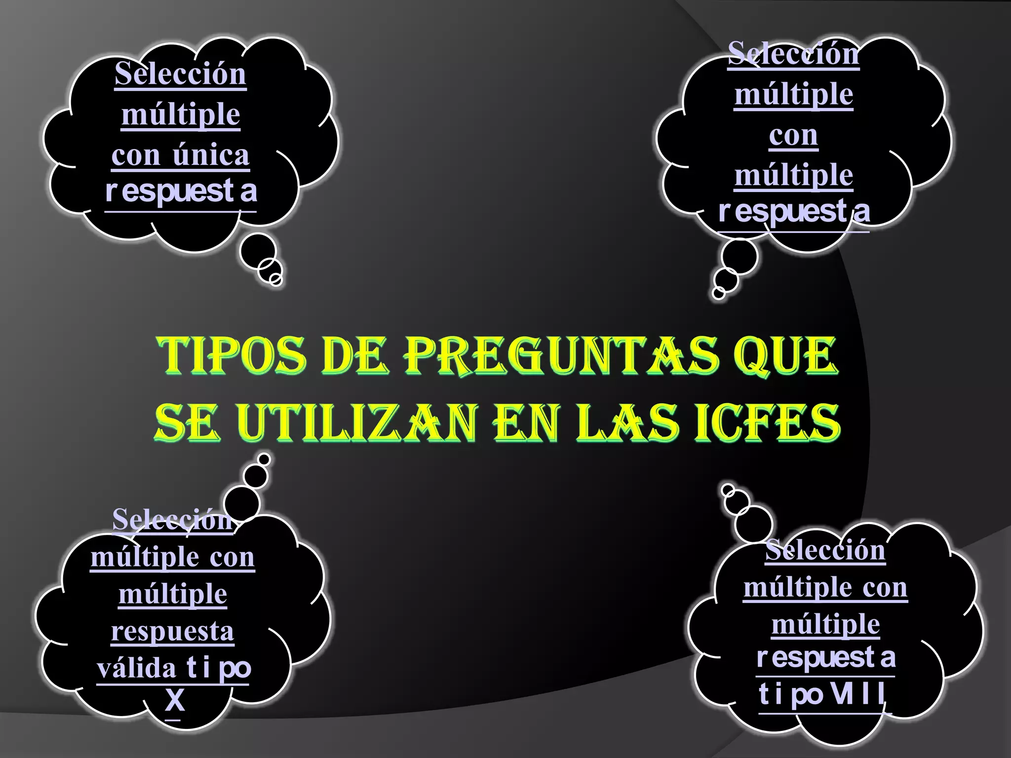 Este documento describe diferentes tipos de preguntas de selección múltiple utilizadas en pruebas de evaluación. Incluye preguntas con una única respuesta múltiple, preguntas que requieren seleccionar la combinación correcta de dos opciones, y preguntas que presentan un enunciado con cuatro posibles respuestas. También menciona que algunos tipos de preguntas como las de historia y filosofía dejó de usarse en el ICFES desde el 2008.