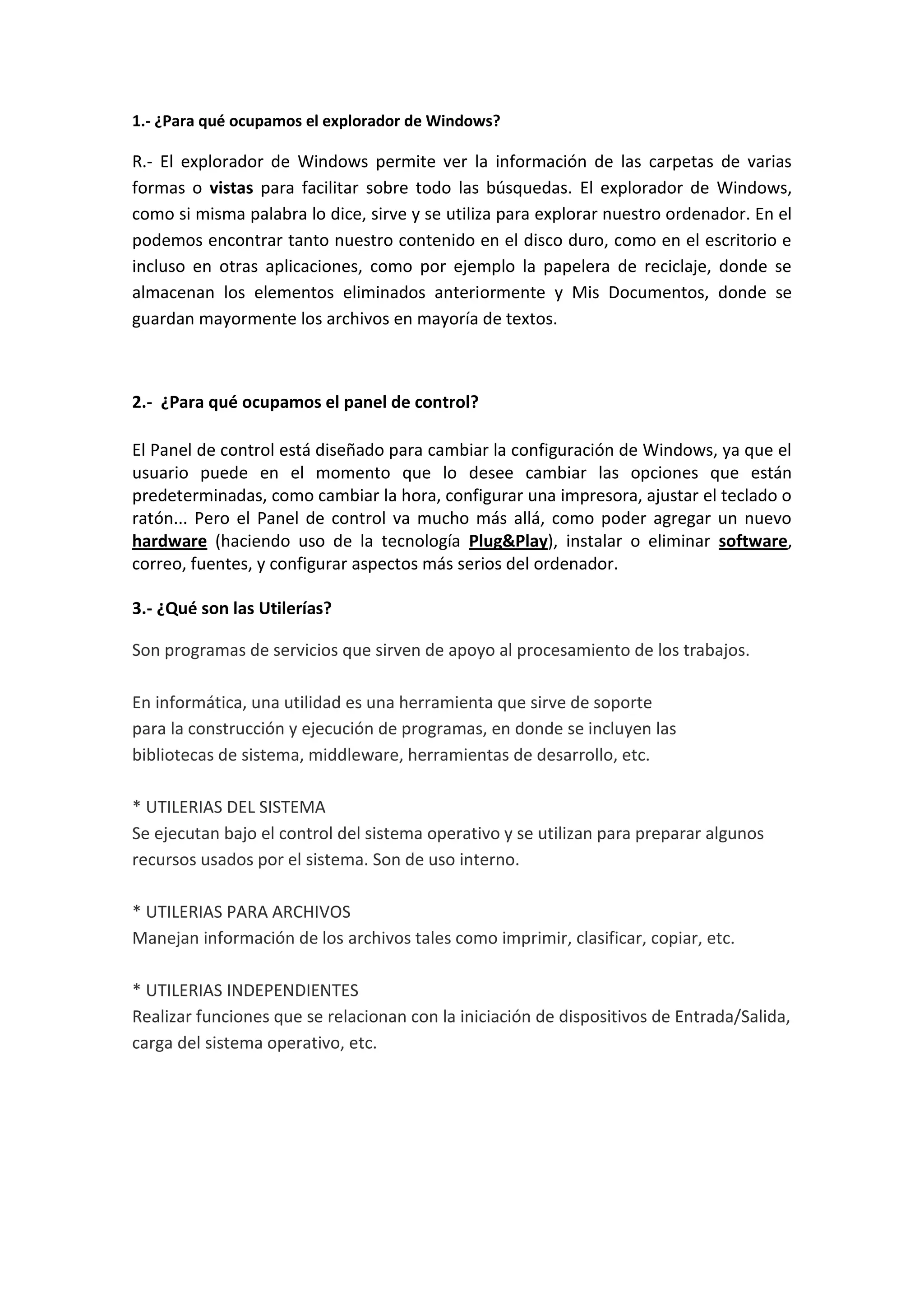 El explorador de Windows permite ver y navegar la información en el disco duro y otras ubicaciones, el Panel de control permite cambiar la configuración de Windows como la hora, impresoras y hardware, y las utilerías son programas de soporte que ayudan con tareas como el procesamiento de archivos, iniciar dispositivos y cargar el sistema operativo.