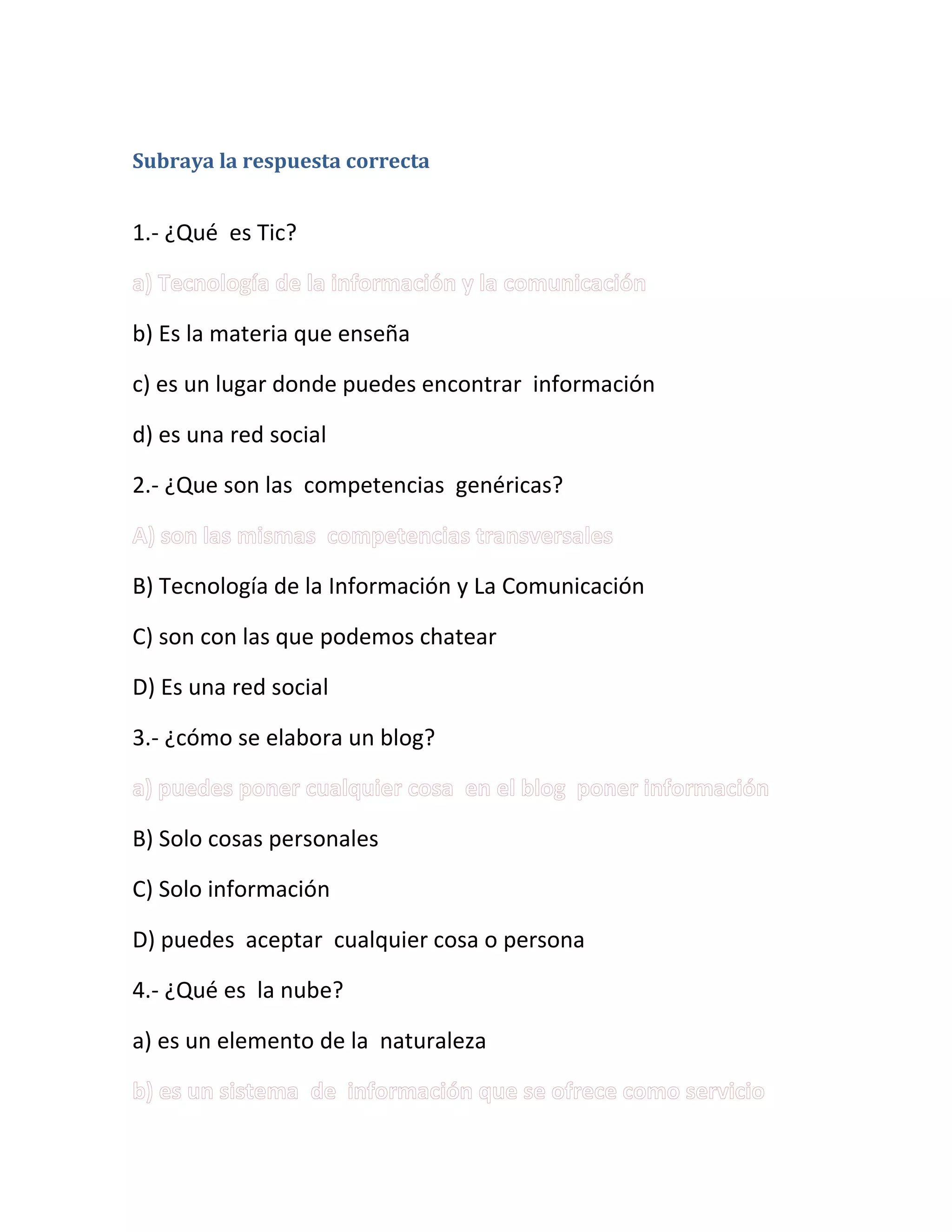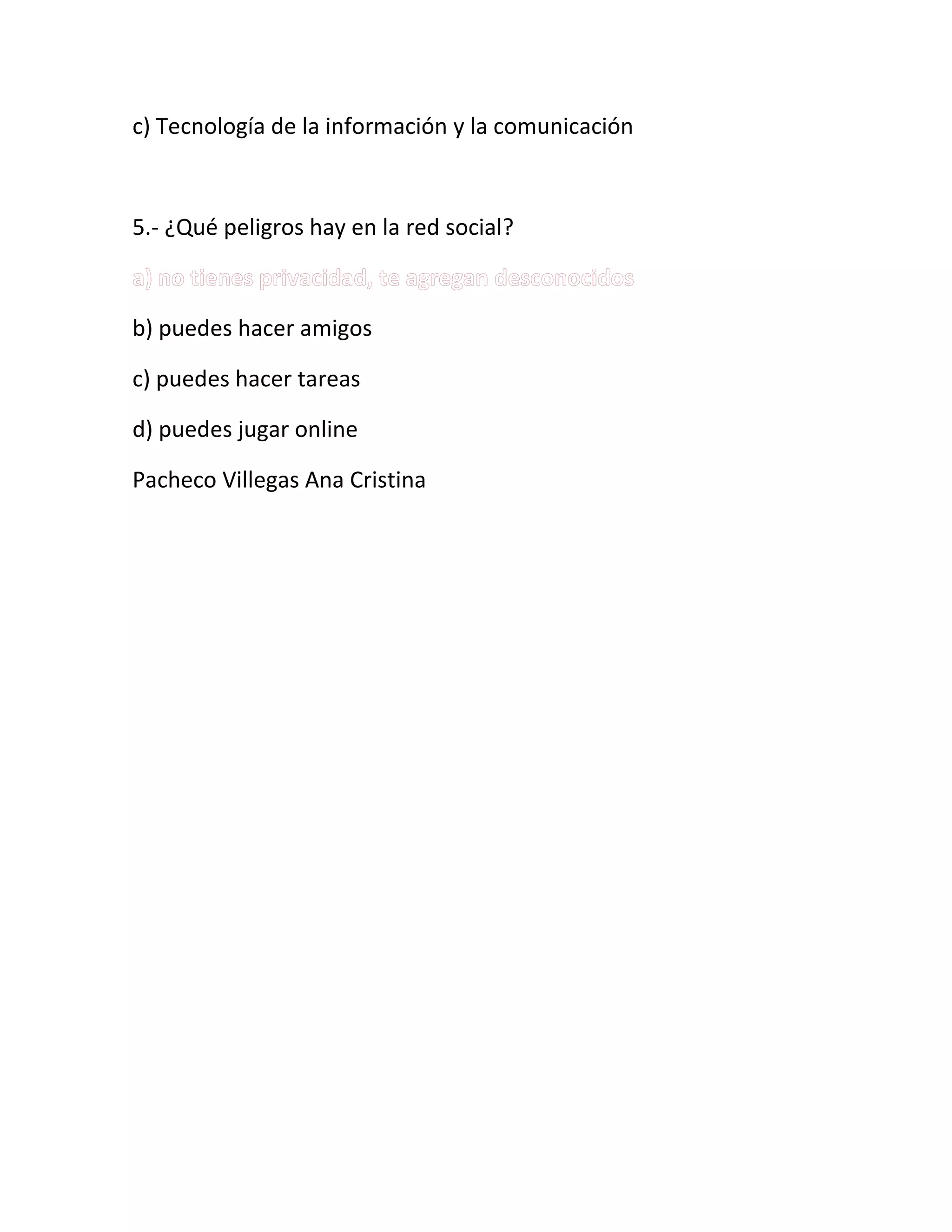 El documento presenta 5 preguntas sobre conceptos relacionados con la tecnología de la información y comunicación. La primera pregunta se refiere a Tic como una red social. La segunda habla sobre las competencias genéricas como Tecnología de la Información y Comunicación. La tercera indica que en un blog se puede aceptar cualquier contenido o persona. La cuarta identifica a la nube como tecnología de la información y comunicación. Y la quinta señala posibles peligros en las redes sociales más allá de hacer amigos, tareas o jugar online