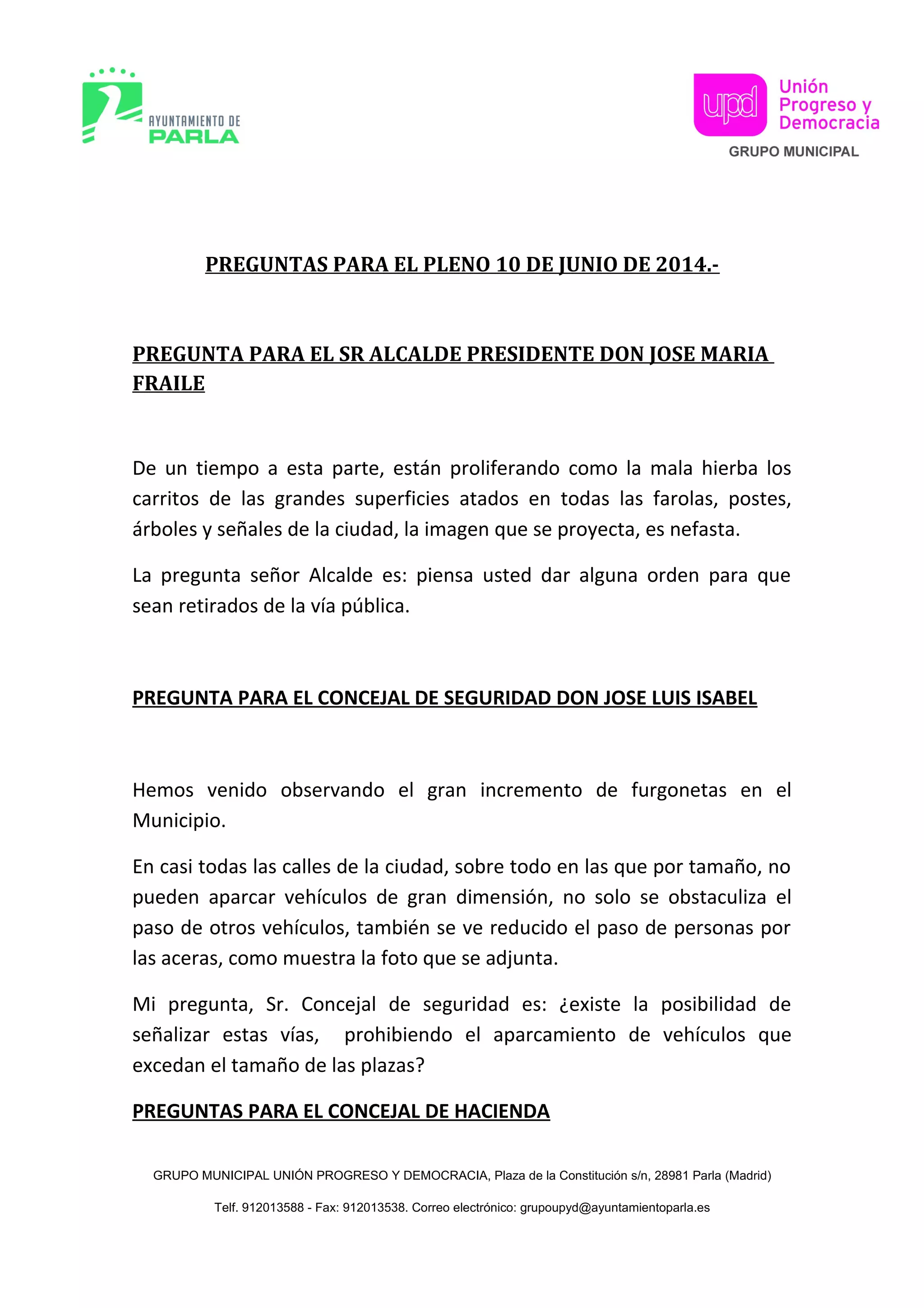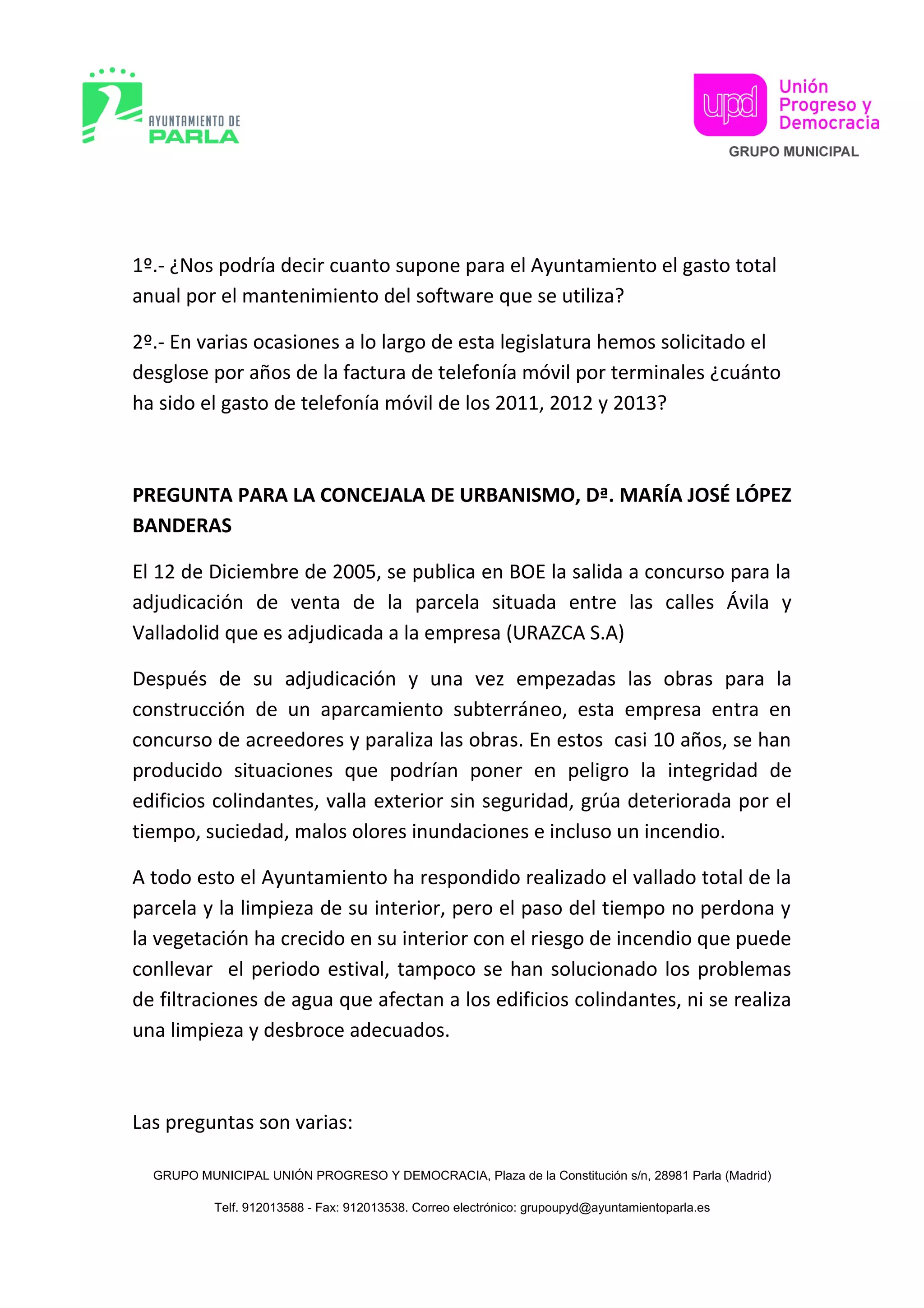 Este documento contiene varias preguntas dirigidas a diferentes concejales del Ayuntamiento de Parla sobre diversos temas como la retirada de carritos de supermercado de la vía pública, la posibilidad de prohibir el aparcamiento de grandes vehículos en calles estrechas, los gastos de software y telefonía del Ayuntamiento, el estado de una parcela adjudicada en 2005 para un aparcamiento subterráneo que fue paralizado, y el mantenimiento de zonas aledañas a un edificio colindante con dicha parcela