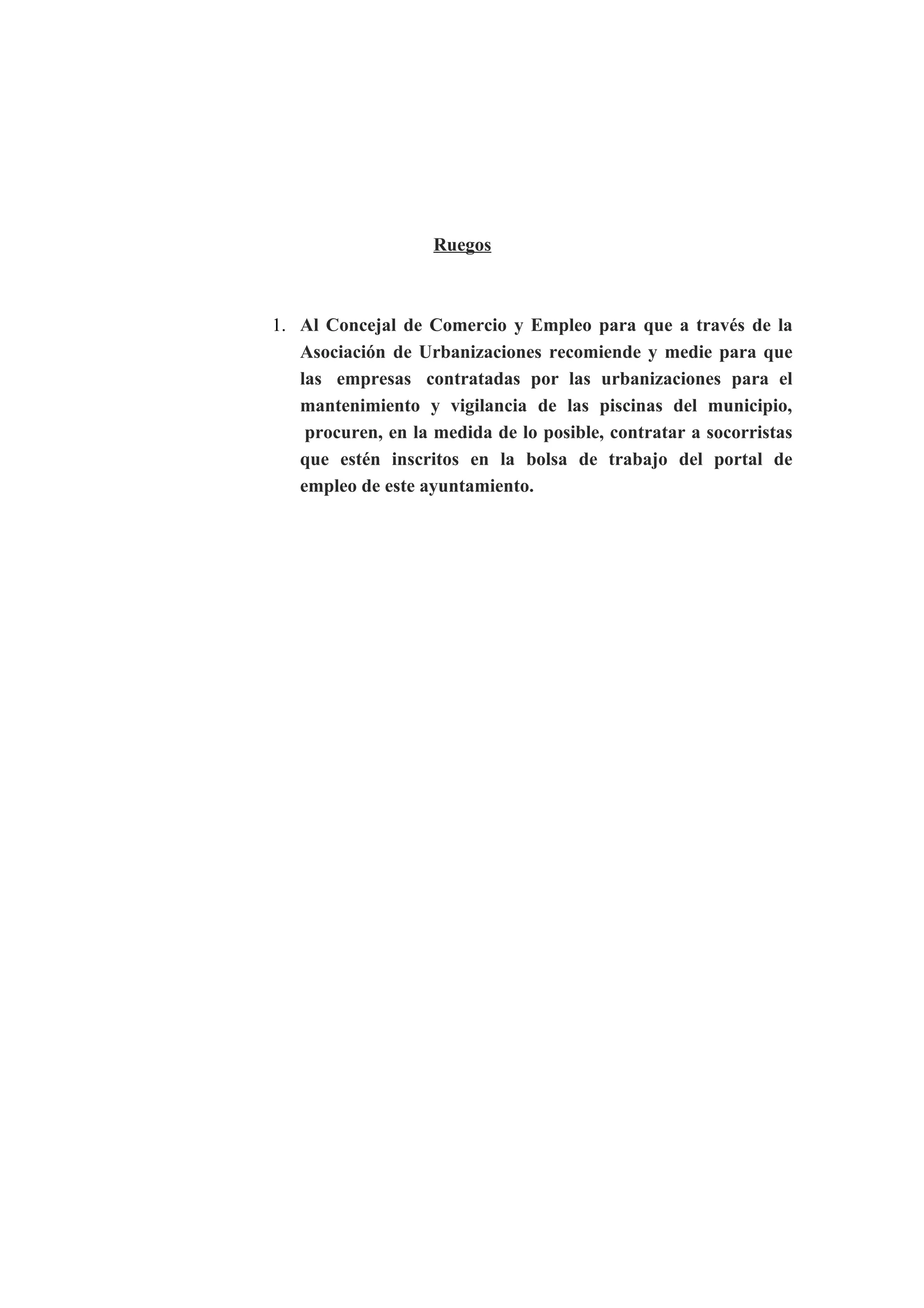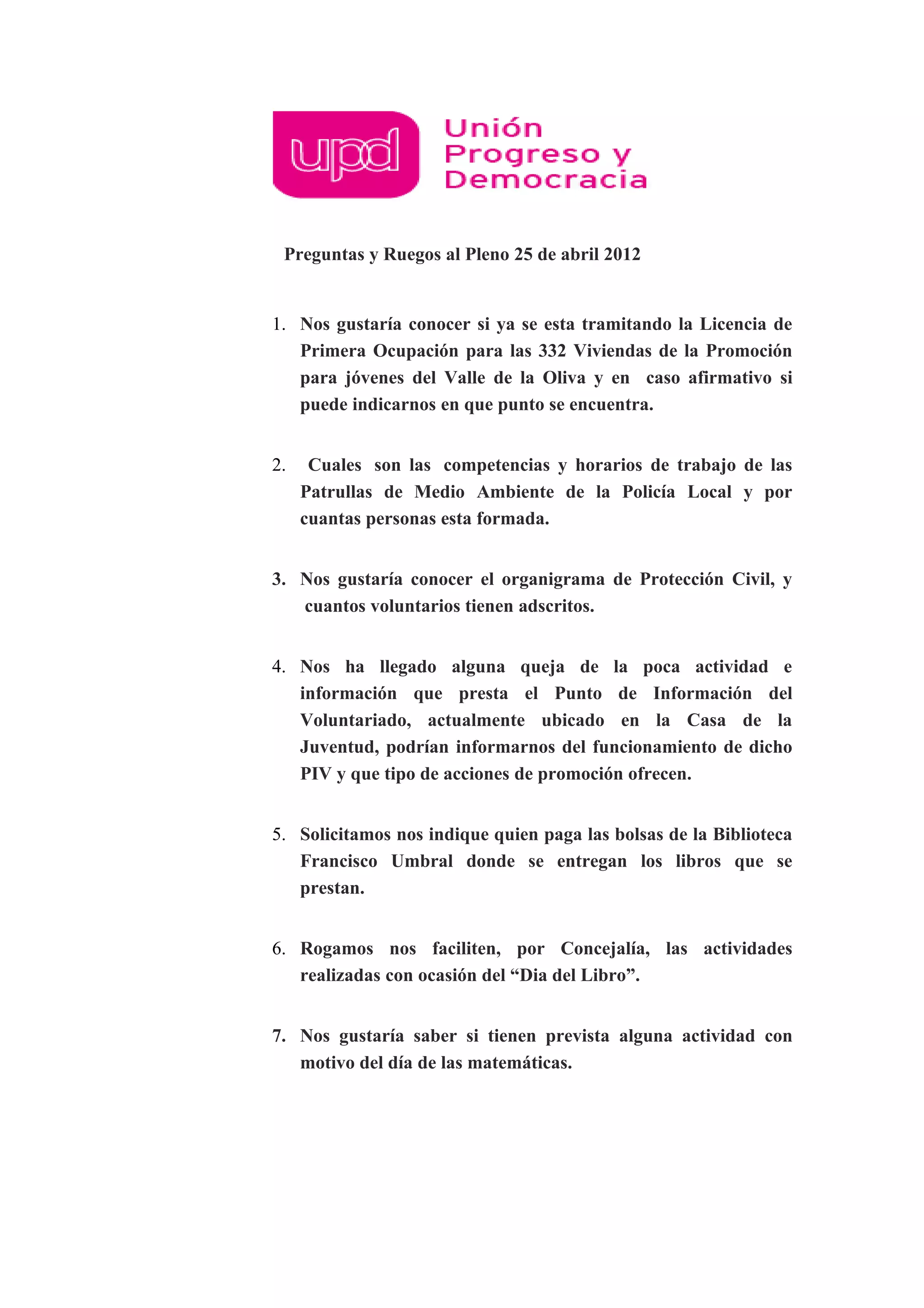 Este documento contiene 7 preguntas y 1 ruego relacionados con temas como la licencia de primera ocupación para viviendas, las competencias de las patrullas de medio ambiente, el organigrama de protección civil, el funcionamiento del punto de información de voluntariado, quien paga las bolsas de la biblioteca, las actividades realizadas con motivo del día del libro y si hay actividades previstas para el día de las matemáticas. También incluye un ruego para recomendar a las empresas contratadas por las urbanizaciones que contraten