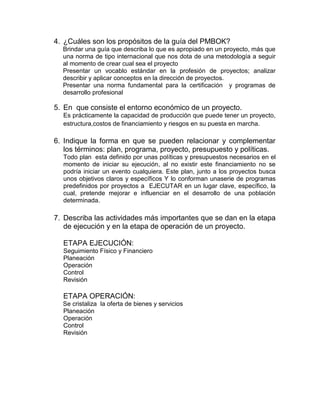El documento presenta un cuestionario de 7 preguntas sobre conceptos básicos de gestión de proyectos realizado por el Servicio Nacional de Aprendizaje (SENA) de Colombia. Las preguntas definen tipos de proyectos como sociales, productivos e infraestructura, diferencian proyectos sociales de privados, enumeran consecuencias de una inadecuada identificación de proyectos, describen los propósitos de la guía PMBOK y las actividades clave de las etapas de ejecución y operación.