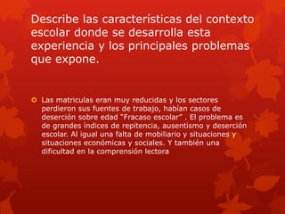 El documento describe las características de un contexto escolar con problemas como matrículas reducidas, desempleo, repitencia, ausentismo y deserción escolar debido a falta de recursos. Los docentes enfrentan estos desafíos implementando nuevas modalidades y enseñanzas para identificar cambios y evitar que los niños abandonen la escuela. El aprendizaje depende del contexto educativo, las concepciones del maestro sobre el desarrollo humano y brindar a los estudiantes un entorno escolar favorable para su aprendizaje integral