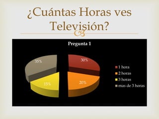 Este documento resume los resultados de una encuesta realizada a un curso de 2o medio sobre sus hábitos de ver televisión. La mayoría ve más de 3 horas de televisión al día y les gusta ver películas y series. Más del 60% ve la televisión en el living y no tiene un horario fijo para verla. Además, la mitad dedica tiempo igual a ver televisión y estudiar, y la mayoría tiene televisión por cable y más de 2 televisores en su casa.