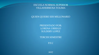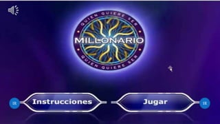 Este documento presenta las instrucciones y preguntas de un juego de concurso llamado "¿Quién quiere ser millonario?" que fue presentado por dos estudiantes de tercer semestre en la Escuela Normal Superior de Villahermosa, Tolima. El juego consiste en que los grupos participantes deben elegir la respuesta correcta a múltiples preguntas sobre temas como electricidad, física, tecnología y computación. El primer grupo en llegar a la pregunta final y responderla correctamente ganará 10 puntos. El documento incluye 20 preguntas con