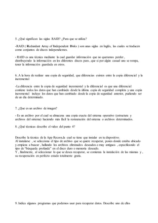 Este documento proporciona información sobre cómo mantener la seguridad de una computadora y recuperar datos y aplicaciones. Describe siete pasos para mantener una computadora segura, incluido tener un antivirus actualizado y realizar copias de seguridad. Explica por qué es importante instalar actualizaciones de software y hardware. También cubre técnicas como RAID, copias de seguridad incrementales vs. diferenciales, archivos de imagen y programas para recuperar datos eliminados como Recuva y MiniTool Power Data Recovery.