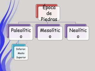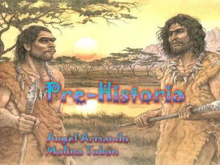 El documento resume las principales etapas de la prehistoria humana, incluyendo el Paleolítico Inferior, Medio y Superior, el Mesolítico y el Neolítico. Durante el Paleolítico, los primeros humanos fabricaban herramientas de piedra y cazaban grandes animales. En el Mesolítico continuaron siendo cazadores-recolectores nómadas. Finalmente, en el Neolítico los humanos comenzaron a producir sus propios alimentos a través de la agricultura y la domesticación de animales, volvi