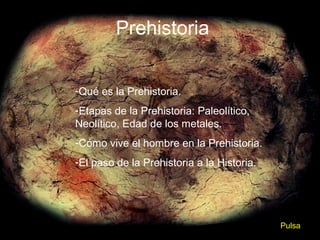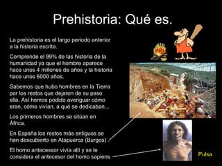 La prehistoria abarca desde la aparición del hombre hace 4 millones de años hasta la aparición de la escritura hace unos 6,000 años. Se divide en Paleolítico, Neolítico y Edad de los Metalos. En el Paleolítico, los primeros humanos eran cazadores-recolectores nómadas que vivían en cuevas. En el Neolítico, los humanos se volvieron agricultores y ganaderos sedentarios. La Edad de los Metalos trajo el descubrimiento del cobre, bronce e hierro. El paso de la