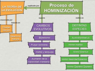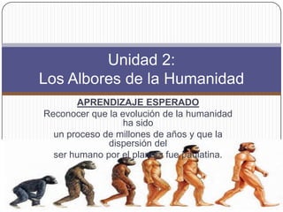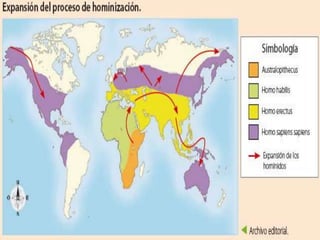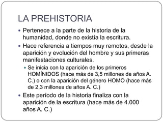 El documento resume la prehistoria desde la aparición de los primeros homínidos hace millones de años hasta el desarrollo de la escritura hace miles de años. Explica que la evolución humana fue un proceso largo que llevó a la dispersión gradual de los humanos por el planeta. Describe las principales etapas de la prehistoria como el Paleolítico, Neolítico y la Edad de los Metales, durante la cual se desarrollaron tecnologías como la metalurgia y surgieron las primeras ciudades.