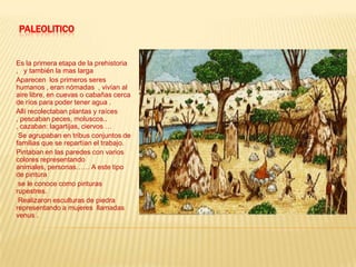 El documento resume las tres etapas principales de la prehistoria: el Paleolítico, el Neolítico y la Edad de los Metales. Durante el Paleolítico, los primeros seres humanos eran nómadas que cazaban y recolectaban. En el Neolítico, los humanos se volvieron sedentarios debido al descubrimiento de la agricultura y la ganadería. Finalmente, durante la Edad de los Metales se produjeron objetos de metal como espadas y hachas, y aparecieron monumentos megalíticos