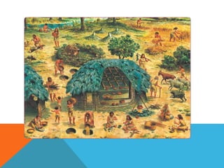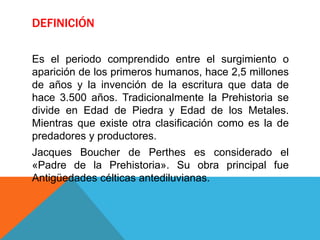 La prehistoria se extiende desde la aparición de los primeros humanos hace 2,5 millones de años hasta la invención de la escritura hace 3.500 años, y se divide en la Edad de Piedra y la Edad de los Metales. La Edad de Piedra abarca el Paleolítico, Mesolítico y Neolítico, destacándose la evolución de herramientas y el desarrollo de la agricultura, mientras que la Edad de los Metales incluye el uso del cobre, bronce y hierro, permitiendo la formación de civilizaciones. Entre las innovaciones neolíticas se encuentran la agricultura, ganadería y la vida sedentaria, transformando la estructura social y económica de las comunidades.