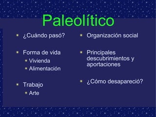 El documento resume las principales etapas de la prehistoria: el Paleolítico, el Neolítico y la Edad de los Metales. En el Paleolítico, los humanos eran cazadores-recolectores nómadas que vivían en cuevas y usaban utensilios de piedra. En el Neolítico se volvieron sedentarios debido a la agricultura y ganadería, viviendo en poblados y usando cerámica. La Edad de los Metales trajo el uso del cobre, bronce e hierro, el comercio,