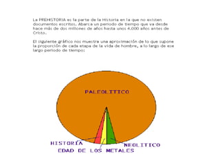 La prehistoria abarca desde la aparición del hombre hasta la invención de la escritura hace unos 5,000 años, y se divide en la Edad de Piedra y la Edad de los Metales. Durante la Edad de Piedra, los primeros homínidos evolucionaron hacia el Homo sapiens, aprendieron a usar herramientas de piedra y fuego, y pasaron de una vida nómada de caza y recolección a una vida sedentaria de agricultura y ganadería durante el Neolítico. Luego, en la Edad de los Metales