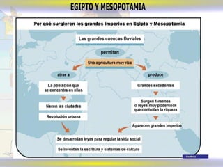 Mesopotamia se desarrolló entre los ríos Tigris y Éufrates desde el 4000 a.C. hasta el 600 a.C., siendo habitada por los sumerios, acadios, asirios y babilonios. Inventaron la escritura cuneiforme, la rueda y el calendario. Sus principales ciudades fueron Ur, Babilonia y Nínive, donde practicaban religiones politeístas y desarrollaron importantes aportes a las matemáticas, astronomía y agricultura.