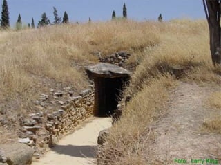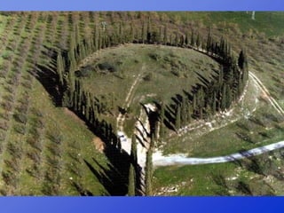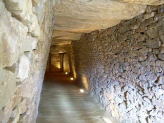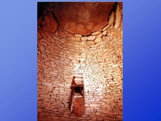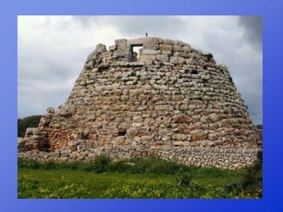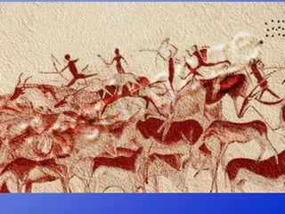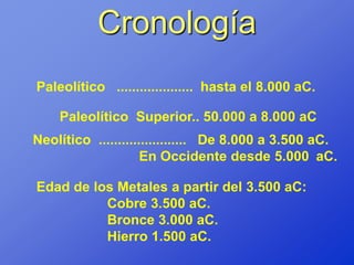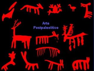 Este documento resume la cronología de la prehistoria desde el Paleolítico hasta la Edad de los Metales, incluyendo el Neolítico. Explica los orígenes del arte a través de la ansiedad y el miedo humano, así como su función mágico-religiosa. Detalla los principales temas de la pintura paleolítica como el símbolo y el animal, e incluye imágenes de arte rupestre de varias cuevas francesas y españolas. Finalmente, presenta ejemplos de arquitectura megalítica y