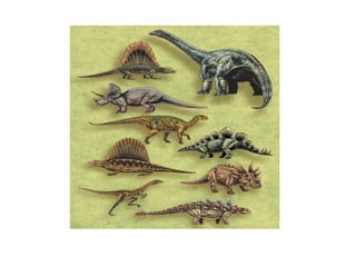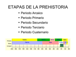 El documento resume las etapas de la prehistoria, incluyendo el periodo arcaico, primario, secundario, terciario y cuaternario. También cubre temas como los dinosaurios, pinturas rupestres, viviendas y utensilios de la prehistoria como vasijas y armas.