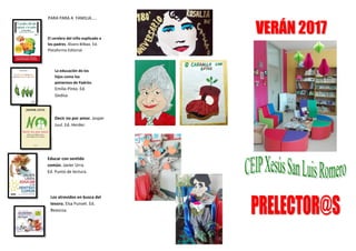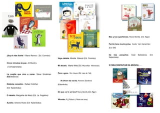 Este documento lista varios títulos de libros infantiles y para padres. Incluye libros ilustrados como "¡Soy el más fuerte!" y "Elefante comellón", así como libros sobre educación de los hijos como "La educación de los hijos como los pimientos de Padrón" y "Decir no por amor". También menciona libros musicales y de aventuras.