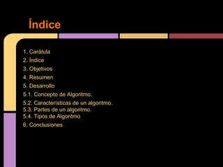 Este documento contiene información sobre algoritmos, incluyendo su concepto, características, partes y tipos. Explica que un algoritmo es un procedimiento mecánico para lograr un resultado de manera definida. Detalla las características de los algoritmos, las partes que los componen (entrada, proceso y salida) y los tipos cualitativos y cuantitativos, dando ejemplos de cada uno.