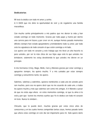 La autora dedica su tesis principalmente a sus padres por darle la vida y apoyarla en todo momento, incluso durante momentos difíciles. También dedica su trabajo a Dios, sus hermanos, cuñados, sobrinos, su novio Chicuelo y amigos por brindarle apoyo a lo largo de su carrera. Finalmente, agradece a sus profesores por confiar en ella y guiarla durante su tesis.