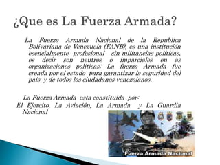 La Fuerza Armada Nacional de Venezuela tiene como misión garantizar la independencia y soberanía de la nación a través de la defensa militar, el mantenimiento del orden interno y la participación en el desarrollo nacional. Está constituida por el Ejército, la Armada, la Aviación y la Guardia Nacional, cada una con funciones específicas de defensa, orden interno y apoyo al desarrollo del país.