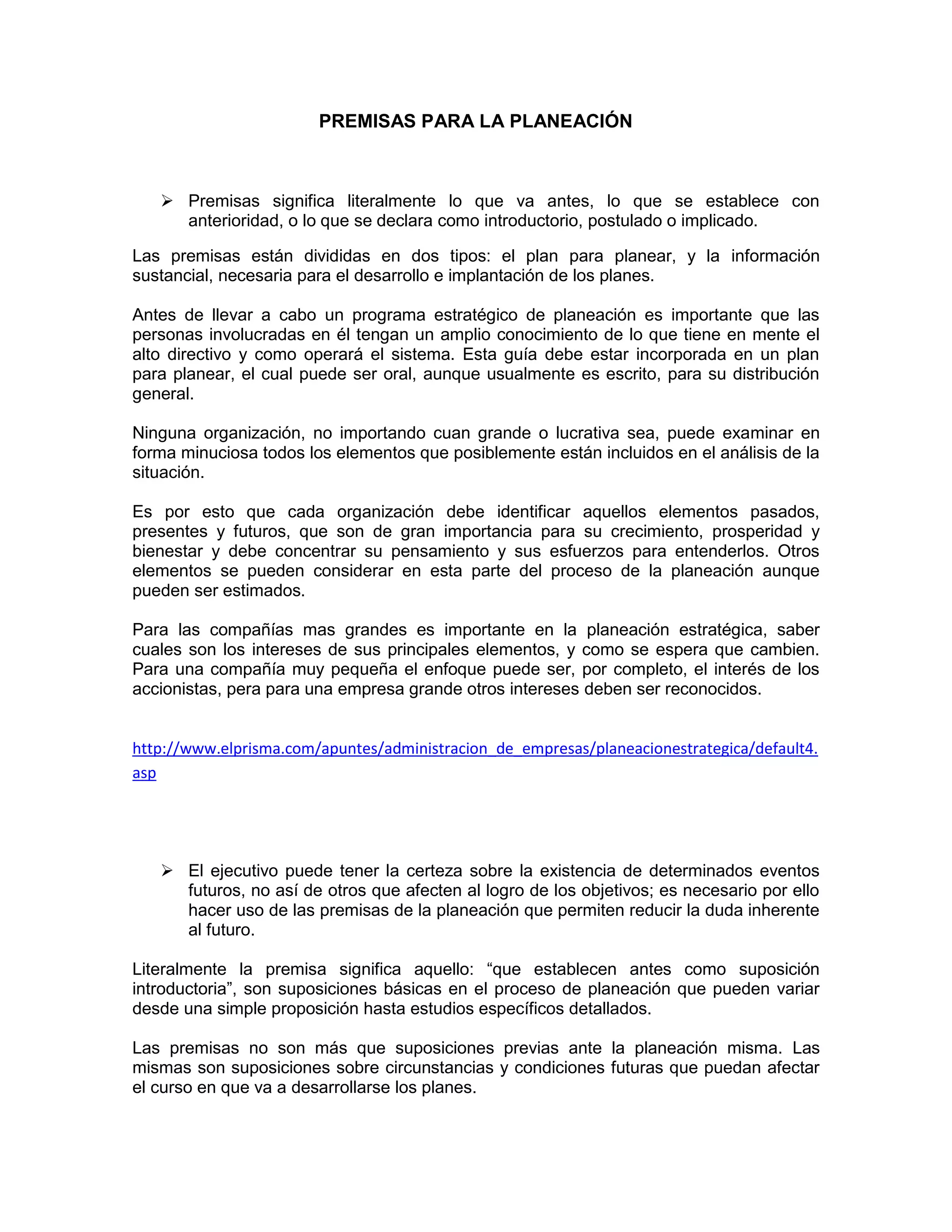 El documento presenta 3 premisas clave para la planificación estratégica: 1) Es importante que las personas involucradas comprendan la visión del alto directivo y cómo funcionará el sistema de planificación. 2) Cada organización debe identificar los elementos pasados, presentes y futuros más importantes para su crecimiento. 3) Para las grandes empresas, es importante considerar los intereses de las principales partes interesadas y cómo pueden cambiar.