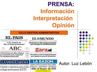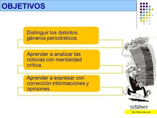 Este documento describe los principales géneros periodísticos de información, interpretación y opinión. Explica que la información transmite hechos de forma objetiva, la interpretación incluye el punto de vista del autor, y la opinión transmite la postura subjetiva del autor. También debate si la prensa debe limitarse a informar objetivamente o puede influir en la opinión, y analiza portadas de diferentes periódicos como ejemplo de los géneros.