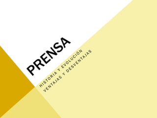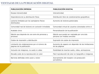 Este documento describe la prensa periódica impresa como el primer medio de comunicación masivo y vehículo del periodismo. Cumple funciones como informar, persuadir, formar opinión y entretener. Aunque el periodismo digital ha ganado popularidad, la prensa impresa sigue siendo más confiable. Tiene ventajas como bajos costos para los lectores y anunciantes, pero también limitaciones como cobertura geográfica poco selectiva y problemas técnicos de impresión.