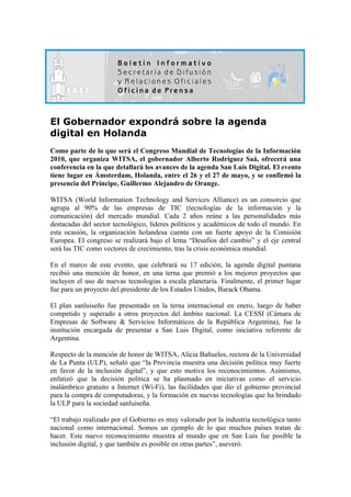 El Gobernador de San Luis, Alberto Rodríguez Saá, expondrá sobre la agenda digital de la provincia en el Congreso Mundial de Tecnologías de la Información en Holanda. El evento tendrá lugar entre el 26 y 27 de mayo y contará con la presencia de 2,000 delegados de 88 países. La agenda digital de San Luis recibió una mención de honor por su inclusión de nuevas tecnologías.