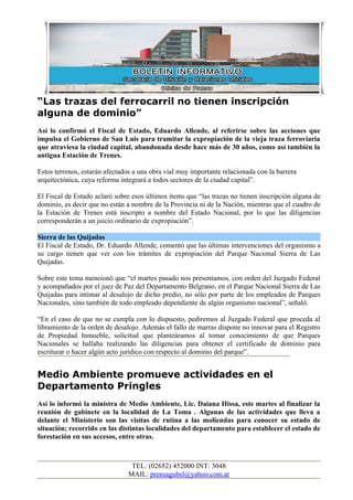 El documento resume las actividades del gabinete provincial durante una reunión en La Toma, incluyendo reuniones con legisladores, productores, docentes y otros sobre temas como seguridad, educación y obras públicas. También describe otras actividades del gobierno como la creación de un registro de productos y servicios ambientalmente amigables.