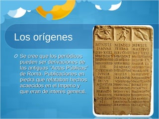 El documento resume la evolución de la prensa desde sus orígenes en las Actas Públicas de Roma hasta el siglo XXI. En el siglo XVII empezaron a publicarse las primeras gacetas de forma semanal, y en el siglo XVIII surgió el primer periódico diario. En el siglo XIX se diferenciaron la prensa política e informativa, y surgieron las agencias de noticias. En el siglo XX surgió la prensa de masas en EE.UU. y Europa. En el siglo XXI, las cabeceras más important